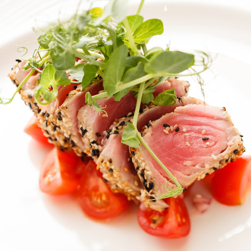 Fresh tuna tataki, sun gold cherry tomatoes & organic greens$12.0012.00 USD